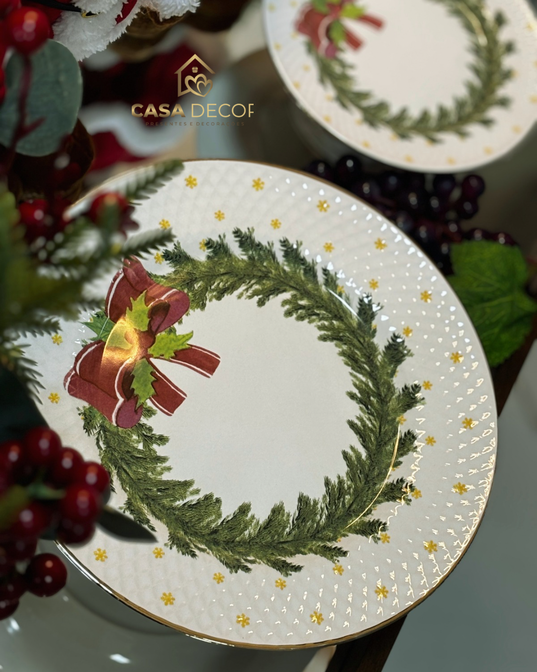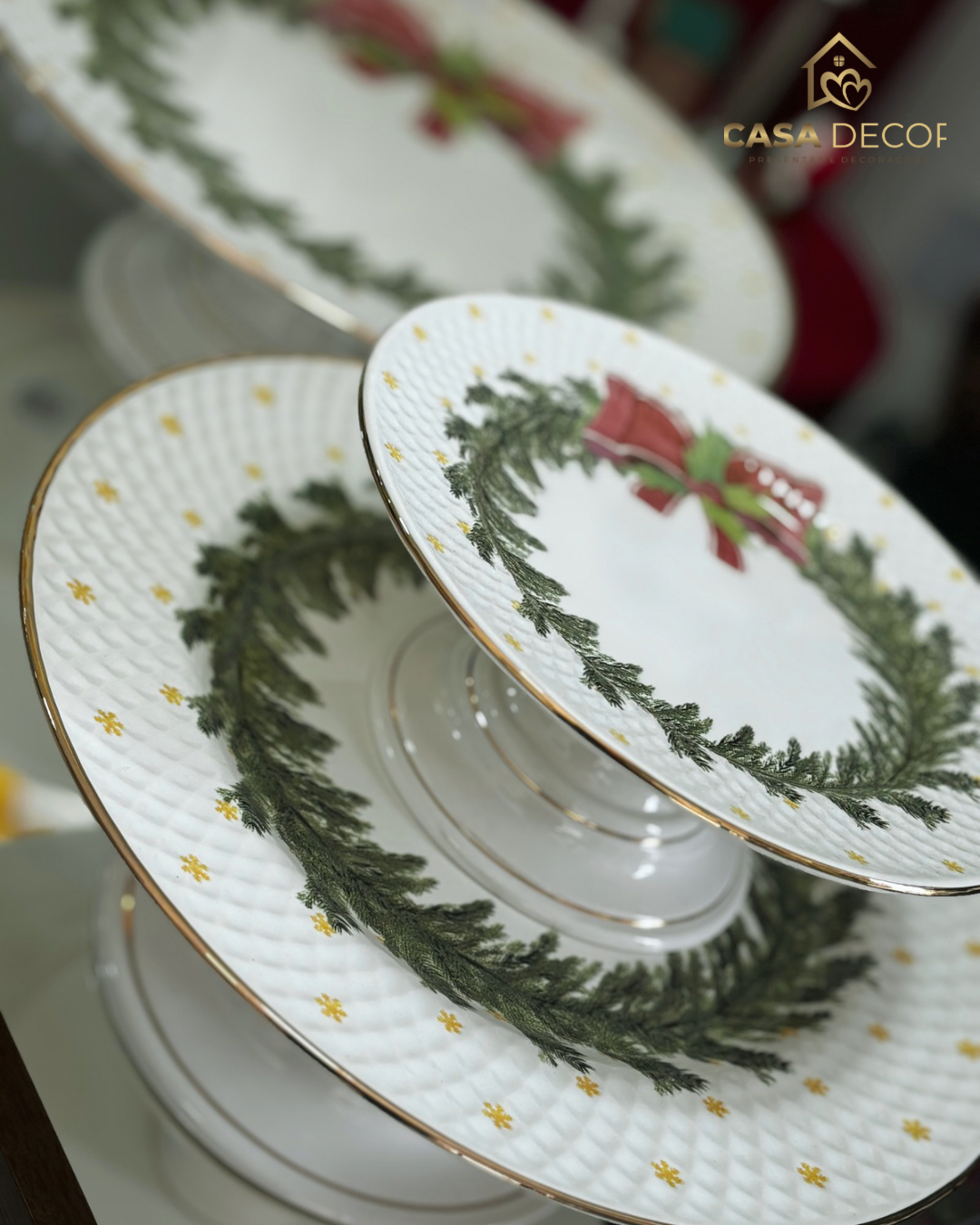 Transforme sua mesa de Natal com esta boleira em porcelana, desenvolvida com acabamento texturizado e borda dourada. A peça apresenta estampa de guirlanda em verde com laço vermelho, trazendo charme e elegância à composição.