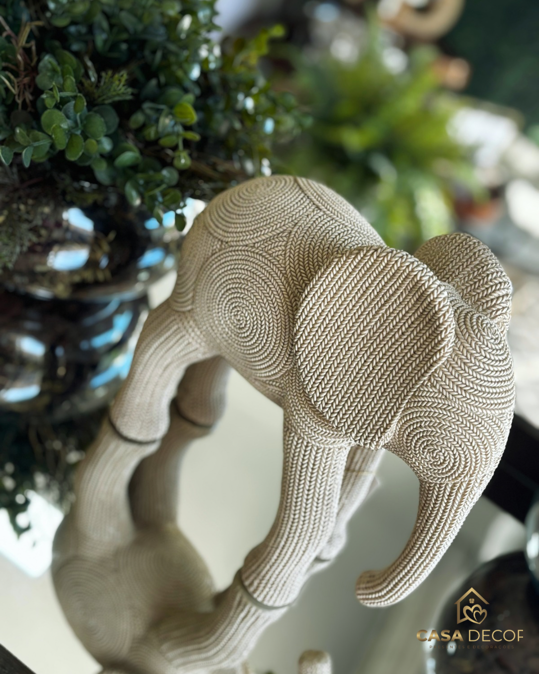 Encante sua decoração com esta belíssima escultura de elefantes em pé, esculpida em resina de alta qualidade com textura que imita corda trançada.