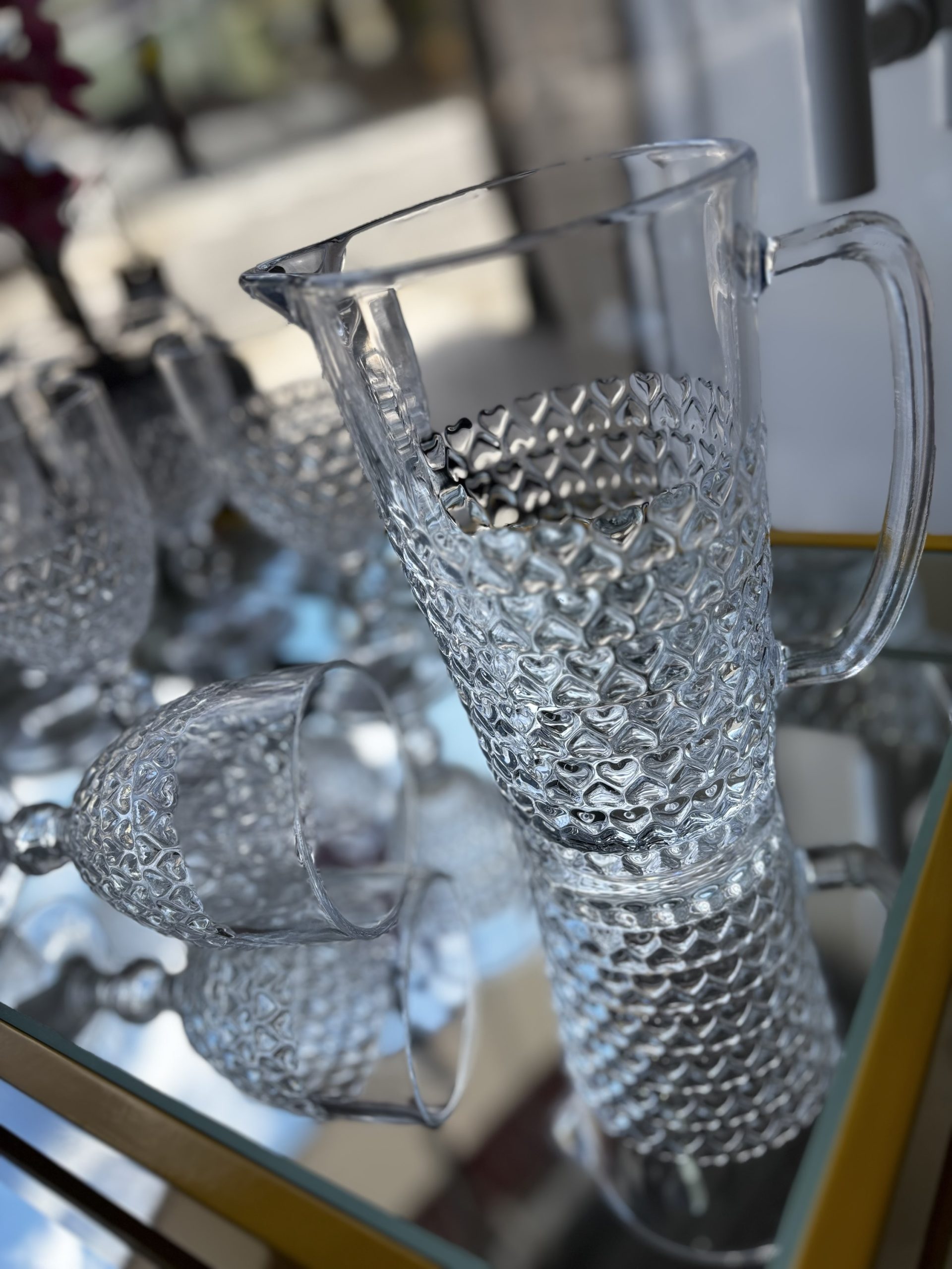 A Jarra de Vidro com Relevo em Formato de Corações é o toque de charme e delicadeza que sua mesa precisa. Com design romântico e acabamento em alto relevo, ela combina elegância e funcionalidade para ocasiões especiais ou o uso diário.