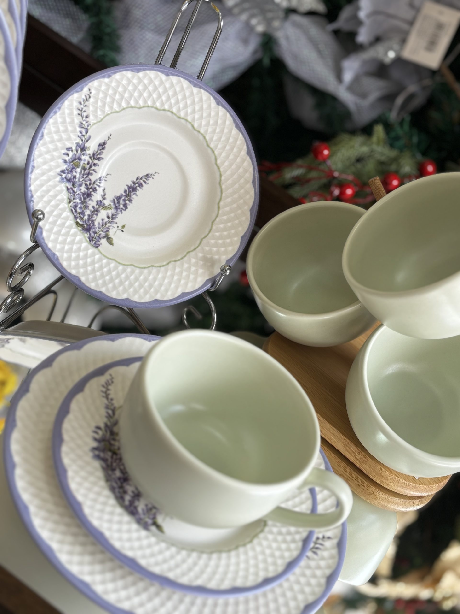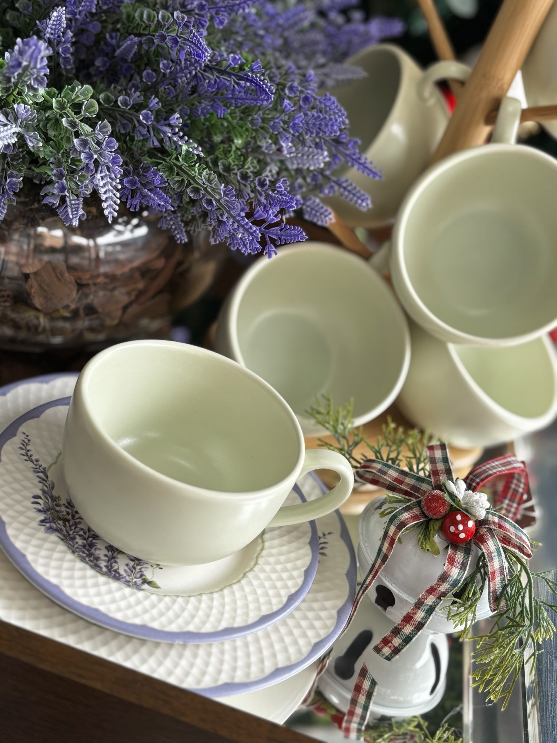 A pintura de ramos de lavanda traz um toque natural e sofisticado, e as xícaras na cor verde menta perfeito para compor mesas que transmitem leveza e bem-estar.