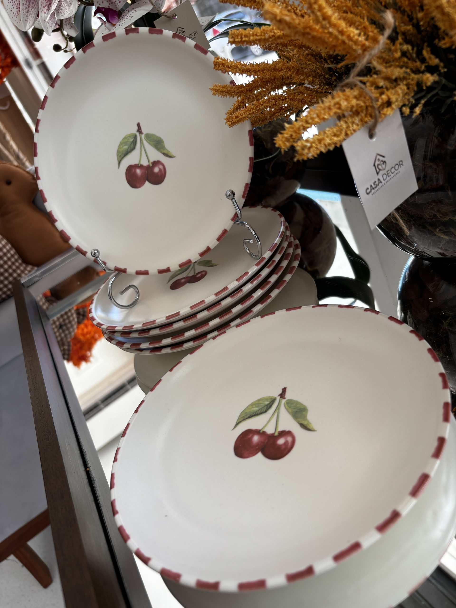 Este prato de sobremesa traz uma proposta doce e sofisticada, com estampa em cerejas , que adiciona um toque lúdico e elegante à composição.