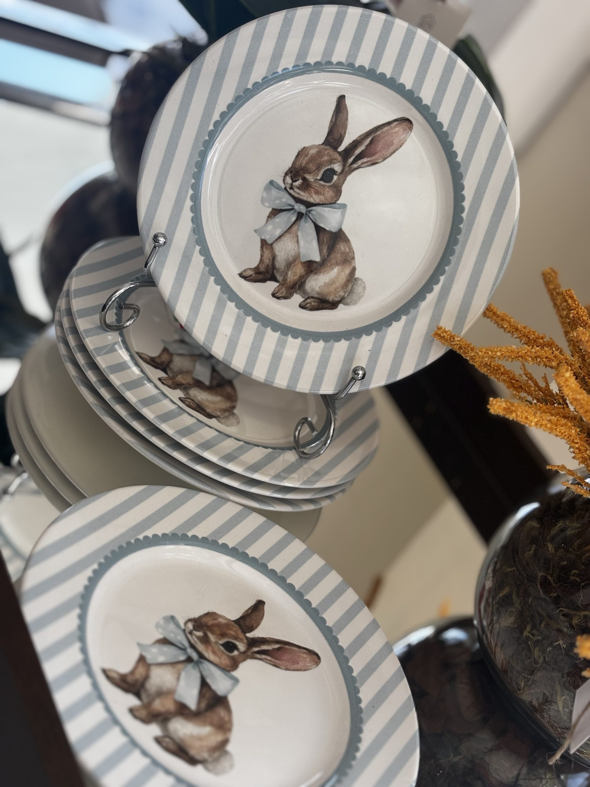 Este prato de sobremesa traz uma proposta doce e sofisticada, com estampa em listras azul e branco e um adorável coelhinho com laço, que adiciona um toque lúdico e elegante à composição.