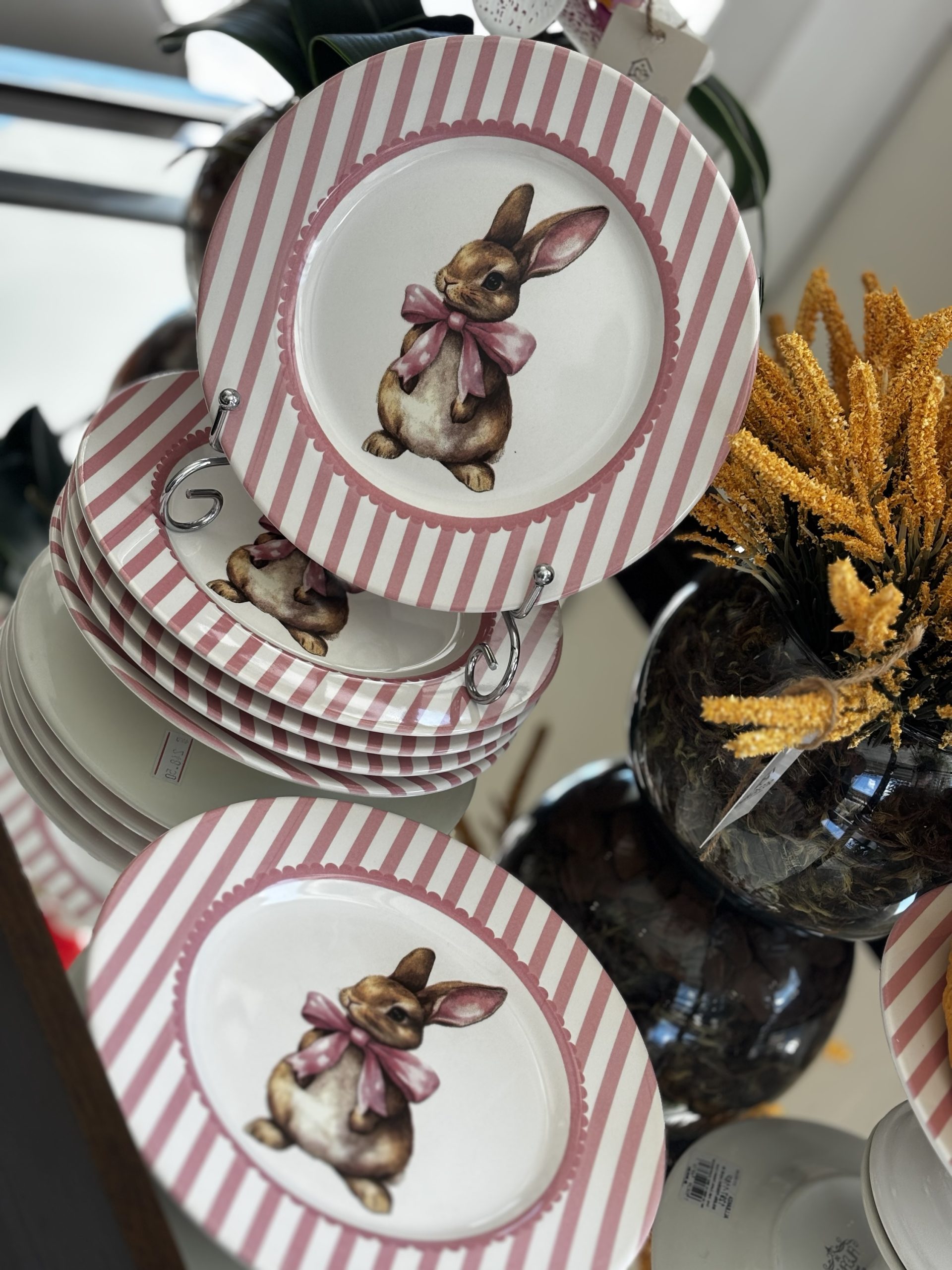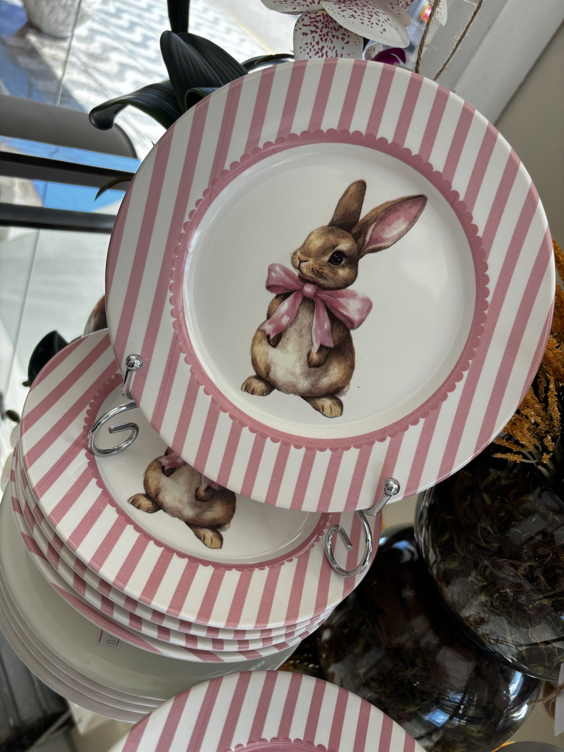 Este prato de sobremesa traz uma proposta doce e sofisticada, com estampa em listras rosa e branco e um adorável coelhinho com laço, que adiciona um toque lúdico e elegante à composição. Perfeito para servir sobremesas, bolos ou doces típicos da época, ele transforma cada detalhe da sua mesa em um momento especial.