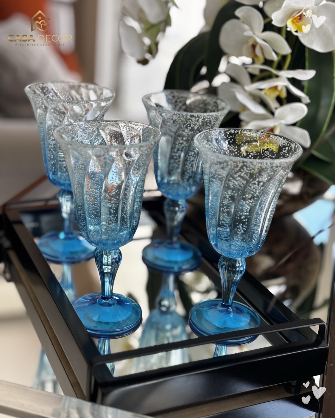 Na tonalidade azul translúcida, essas taças combinam perfeitamente com diferentes estilos de decoração — do clássico ao contemporâneo —, sendo ideais para servir água, sucos, drinks ou até mesmo para compor uma mesa posta impecável.