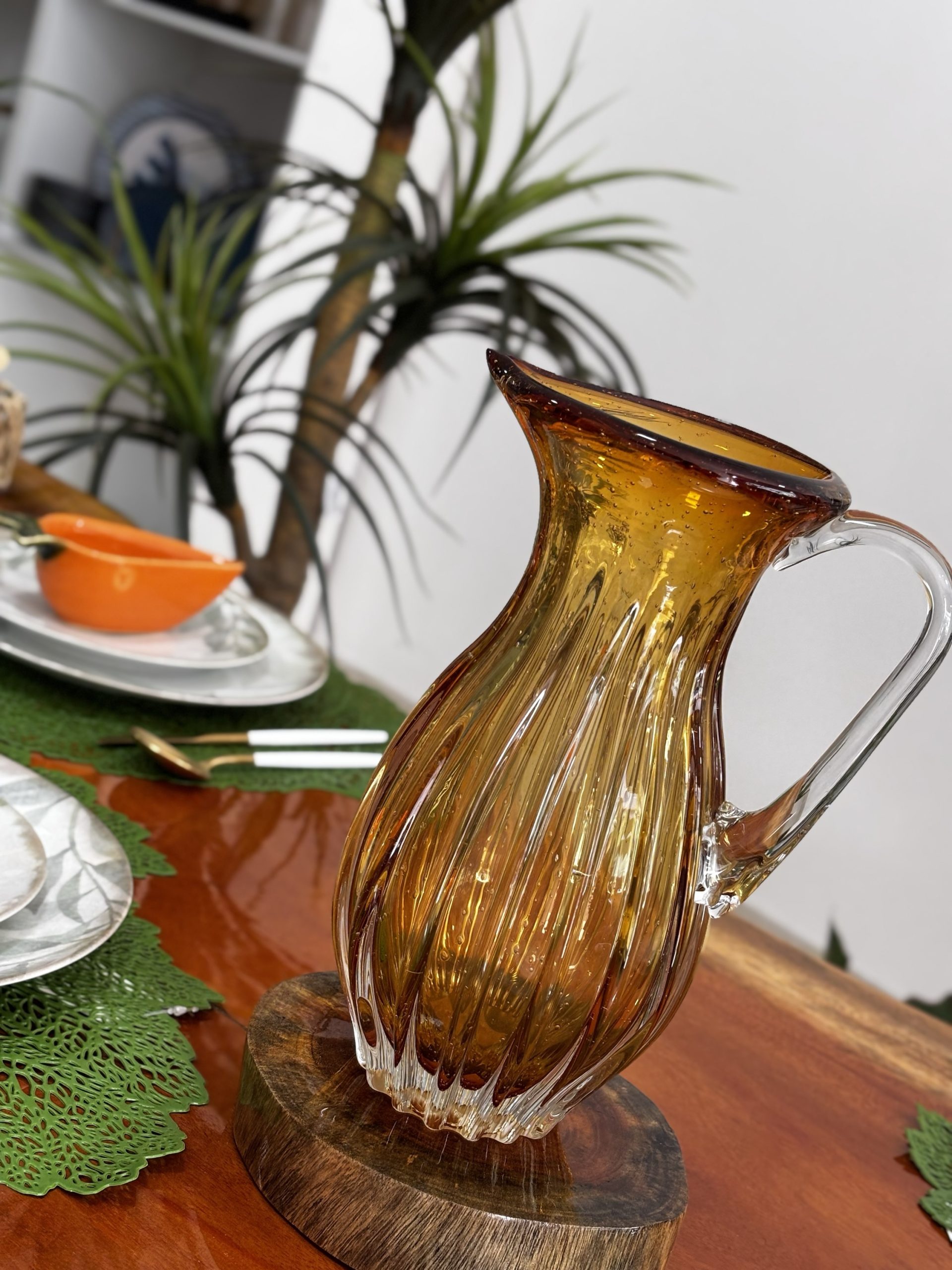 Transforme sua mesa com elegância e sofisticação usando esta jarra de vidro âmbar, perfeita para servir sucos, águas aromatizadas ou refrescos.